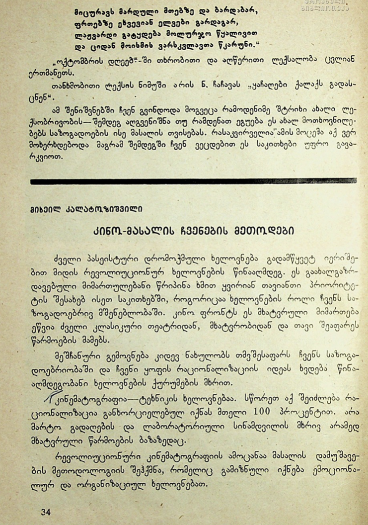 Memarctskheneoba, 2 (1928), p. 34. 1ère page du texte de Kalatozov « Méthodes d’exposition du ciné-matériau » (en géorgien)