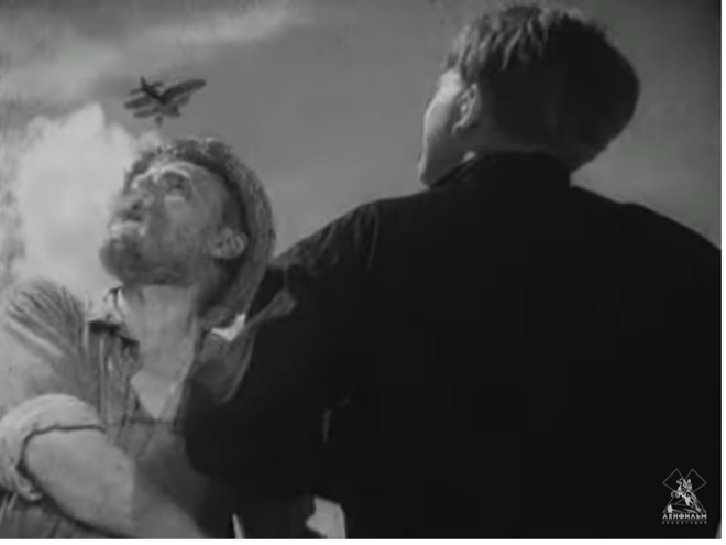 La structure pyramidale (triangulaire) se retrouve dans une séquence de Nepobediyé (Les invincibles, 1943). Sur un toit la jointure des cheneaux de zinc forme un angle ouvrant sur une cour en contrebas où va apparaître un visiteur ; le personnage féminin qui est sur le toit entre alors dans le champ pour occuper la pointe du triangle renversé. Plus tard c’est encore une pyramide sur la pointe qui définit l’espace ouvert sur le ciel d’un abri où se sont réfugiés les deux protagonistes, espace qui va voir sa base renversée redoublée par une escadrille d’avions venus bombarder la ville de Leningrad.