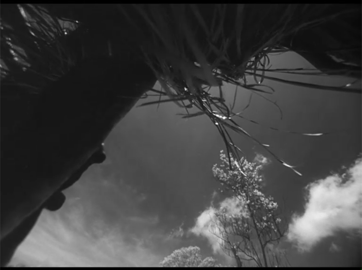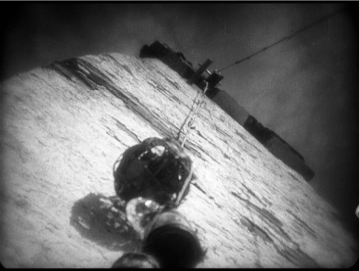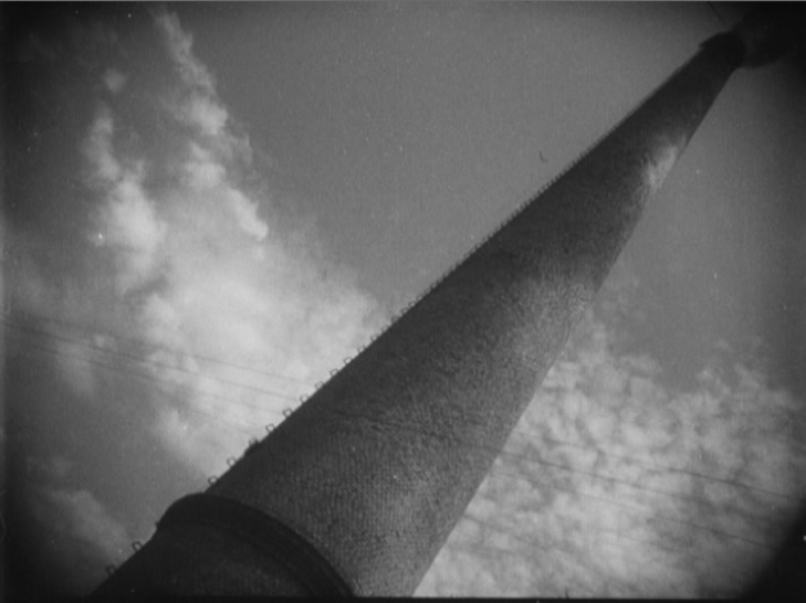 La structure de l’image est donc fondée sur une organisation géométrique (diagonales, verticales, horizontales, cercles, croix). La diagonale des arbres vus en contre-plongée se trouve aussi bien dans Sel de Svanétie que dans Soy Cuba, pour ne rien dire des bouleaux en contre plongée verticale de Quand passent les cigognes qui ont déjà donné lieu à des commentaires les rapprochant des photographies de pins par Rodtchenko37. C’est l’assimilation des arbres à des cheminées d’usine, couramment photographiées ou filmées de la sorte (par Dziga Vertov notamment) – qu’on trouve exemplairement dans Un clou dans la botte avec un renversement gauche-droite d’un plan à l’autre – qui déclencha une polémique dans la presse photographique de l’époque à l’encontre de Rodtchenko. On trouve encore la figure géométrique du cercle, comme dans la scène du battage du blé avec une vue à la verticale du mouvement circulaire du bœuf traînant une planche à clous où ont pris place une mère et son bébé dans Le Sel ou le tambour dans Un clou dans la botte. Dans Le Sel, le mouvement d’appareil, à nouveau, adoptant dans son fonctionnement même la structure de son objet, amplifie ce mouvement circulaire en donnant à voir à 180° le décor environnant depuis la planche en mouvement (de manière comparable à la fameuse scène de Cœur fidèle d’Epstein sur le manège). Dans la scène finale de l’ouverture de la route par les ouvriers terrassiers, le filmage de ces derniers oppose un corps en oblique levant sa pioche et l’abattement de celle-ci dans une structure en triangle (l’ouverture de compas des jambes) qui fait éclater la pierre frappée38. On retrouvera ce type de construction et d’« explosion » dans Un clou dans la botte quand le soldat doit franchir une série de barbelés et qu’il se déchaîne face à l’impossibilité où il se trouve de le faire en raison de son pied blessé.