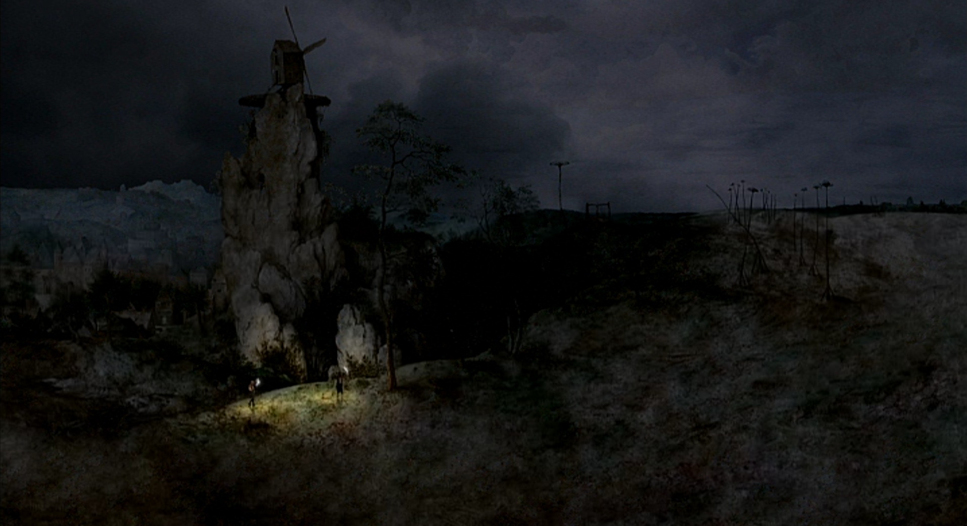 Nous l’avons dit, les deux premiers plans du film sont construits dans le strict respect de la composition picturale. Cela a une conséquence directe sur le hors-champ de ces deux premiers plans : ils sont irréels. On pourrait en effet, en tant que spectateurs, les poser, mais, en stricte obédience avec l’espace pictural, ce qui n’est pas dans le cadre ne s’impose pas comme présence au spectateur, parce qu’il est sans effet sur le champ. En outre, le spectateur peut, comme l’affirme Sartre, alternativement adopter une conscience perceptive, cherchant à déceler les modes de production des différents éléments présents : est-ce du dessin, des personnages filmés, de la 3D, etc. ? Ou viser la scène représentée, reconnaître le Christ, la Vierge, etc. Le champ lui-même relève d'une conscience irréalisante : dans la mesure où Majewski choisit d’imiter les effets de la représentation picturale, le regard du spectateur est conduit à viser, par l’écart et la comparaison implicite avec la toile de Brueghel, ce qui est représenté, les différentes scènes, tout en percevant la différence entre la représentation cinématographique et la représentation picturale, absente, mais suggérée. De ce point de vue, le statut mixte de ces deux premiers plans, qui mêlent un décor repris directement du tableau et des personnages filmés est particulièrement suggestif : il invite le spectateur à alterner entre la toile et sa traduction cinématographique.