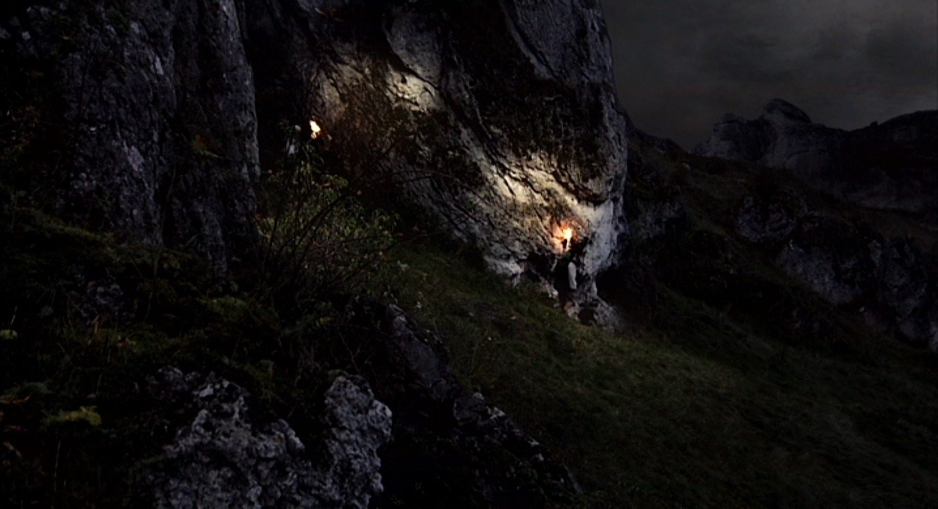 Il reste à envisager un troisième type de couple champ/hors-champ, qui est à l’oeuvre un peu plus loin dans le film à 19’26 (juste après le plan sur le peintre Brueghel jouant avec la toile d’araignée). Un premier plan offre un champ resserré sur un homme assis dans l’herbe, avec un hors-champ indéterminé ; le plan précédent appartenait à un tout autre espace. Pas de raccord possible, pas de hors-champ suggéré, car ce que l’on perçoit est trop partiel pour figurer précisément dans quel univers nous nous trouvons. Le plan suivant nous offre le contrechamp, que nous identifions du fait du renversement axial par rapport à l’homme assis, dont on ne voit plus la face droite mais la face gauche. Apparaît un jeune couple, découvert en début de film dans une intimité de l’aube, chez eux. L’espace découvert permet maintenant de se situer par rapport à l’espace du tableau aperçu en début de film : on reconnait les contreforts rocheux présents dans le tableau. Les sons – le vent, les voix d’enfants – accréditent un hors-champ homogène à ce qu’on perçoit. On sent vibrer un monde ; le hors-champ se peuple sans représentation imaginaire précise, mais plutôt comme si nous étions immergés du point de vue sonore dans un espace dont ne peut voir qu’une portion. Ici, le hors-champ n’est pas de l’ordre de la représentation, mais d’un sentir lié au fait perceptif que la vision du spectateur se trouve très partielle par rapport à ce qu'il entend18, accréditant l’existence d’un univers au-delà de son champ perceptif.