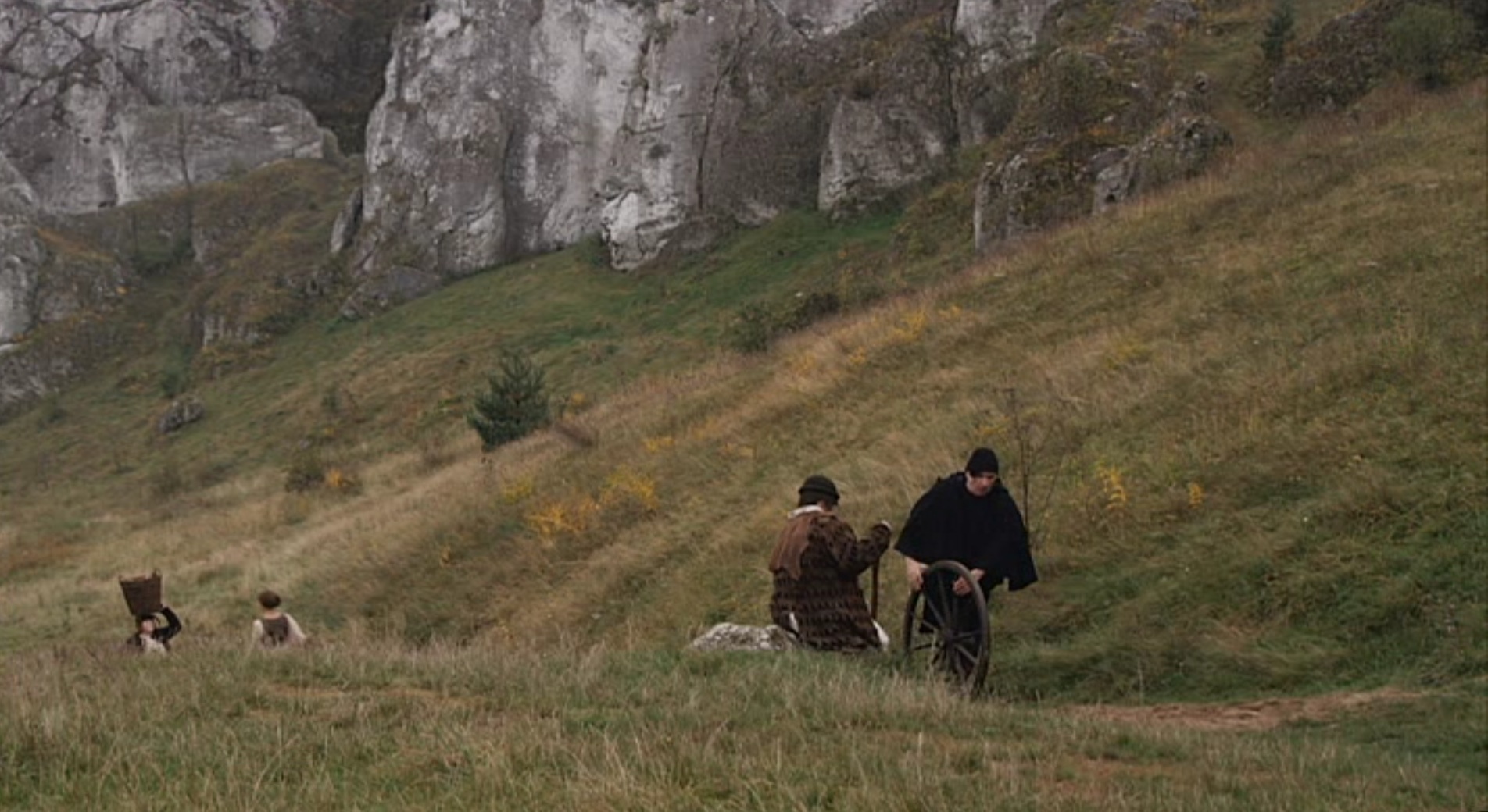 Au troisième plan, il s’agit de l’espace frontal du tableau, mais avec l’introduction de sons hors-champ : la cognée de la hache dans une forêt qu’on ne voit pas. Puis le quatrième plan est introduit par un raccord-mouvement des deux hommes que l’on a vus marcher au plan précédent. En changeant ainsi d’axe par rapport aux deux hommes entre le 3ème et le 4ème plan, on pénètre perceptivement dans l’espace représenté, parce que le changement d’axe suscite chez le spectateur la nécessité d’une réorientation, par laquelle il situe spontanément ce qu’il perçoit actuellement par rapport à ce qu’il voyait au plan précédent. À partir de cette opération, qui est un effet du montage, le spectateur est comme tendu entre le hors-champ déjà vu, qui est constitué par les différents espaces que les plans précédents lui ont donnés à voir et qu’il articule à ce qu’il voit présentement, et un hors-champ qui pourrait devenir champ, mais qui ne lui a pas encore été donné à voir, et qui peut s’appréhender de différentes façons. Nous nous proposons d’analyser quelques-uns des modes d’appréhension du hors-champ par le spectateur, à partir du jeu des possibles qu’offre cette première séquence de The cross and the mill. Nous nous limiterons à l’ouverture du film, parce qu’il nous faut travailler à l’échelle d’un court fragment, afin de comprendre ce qui se passe pour le spectateur au moment des différents changements de plan.