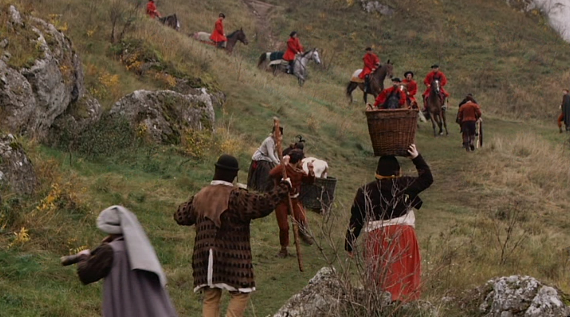 Puis surgit du hors-champ un homme qui court, fuyant quelque chose. La scène burlesque est alors brusquement interrompue par les cris de cet homme terrifié. Le jeune homme, tout proche, assis à côté de sa compagne, semble inquiet. L’élément effrayant provenant du hors-champ entre dans le champ : ce sont des cavaliers espagnols, qui se dirigent vers le jeune homme. Mais bien avant qu’ils ne surgissent, nous appréhendions cette fois le hors-champ sous la forme d’une menace, imprécise, mais imminente.