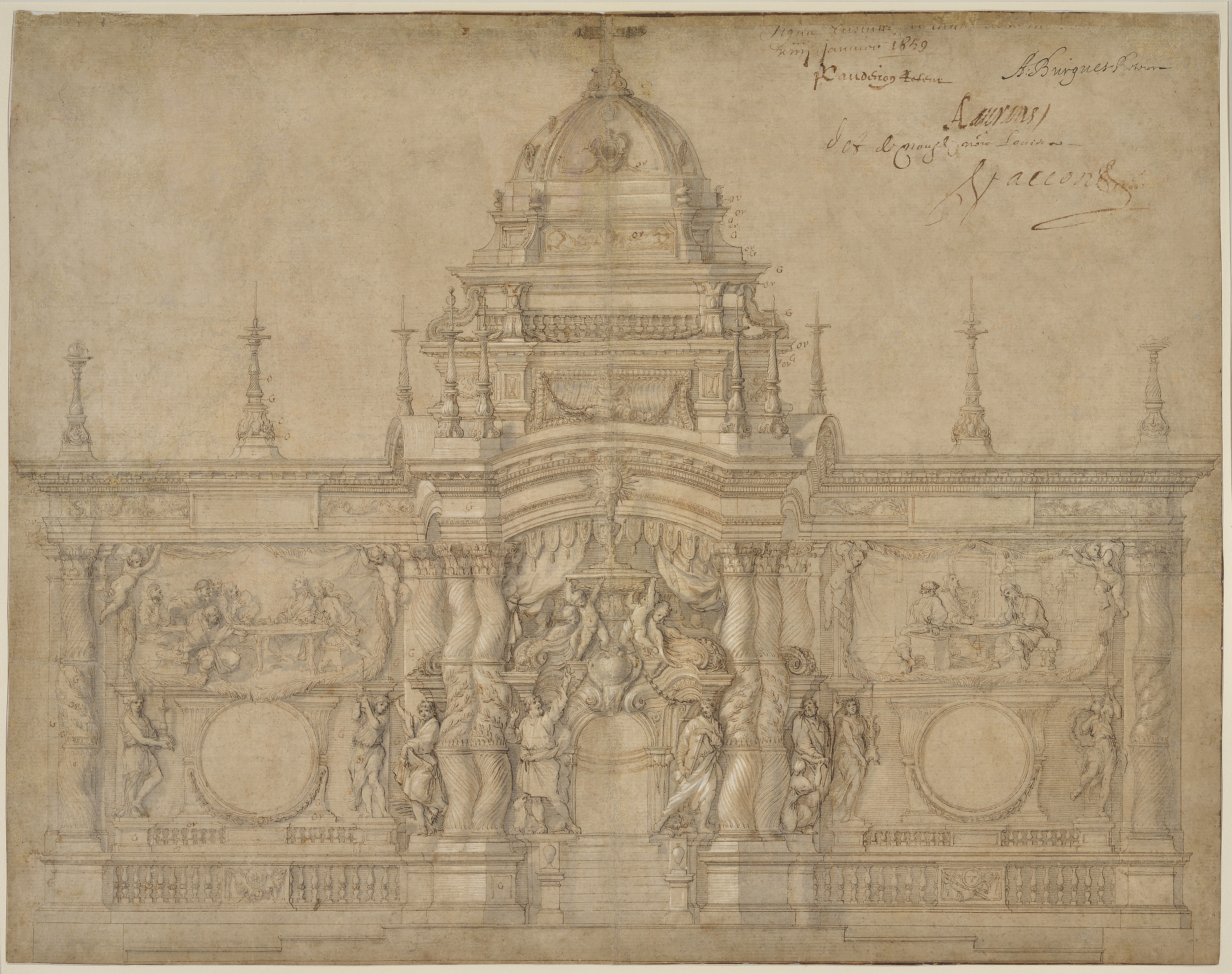 Projet d’autel et de baldaquin pour l’église Santa Maria Assunta di Carignano [Plume, encre brune, lavis d’encre noire], Marseille, musée des Beaux-Arts.