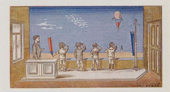 L’image sous l’égide de laquelle nous plaçons cette première partie est un dessin du peintre Max Ernst, rattaché aux mouvements dadaïste et surréaliste, qui date du début des années 1920. Elle fait la couverture d’un recueil de poèmes de Paul Eluard, Répétitions, inspirés par les œuvres du peintre. Benjamin a eu ce recueil entre ses mains et commente cette image en 1927 dans son premier texte sur le surréalisme : Kitsch onirique. Il la décrit ainsi : « Max Ernst a dessiné quatre jeunes garçons. Ils tournent le dos au lecteur, au professeur et à l’estrade, et regardent par-dessus une balustrade un ballon qui flotte en l’air. La pointe posée sur la barre d’appui, un crayon géant se balance »8. Nous retrouvons dans cette description deux éléments essentiels dans l’approche benjaminienne du personnage de l’enfant : la question du regard et du rapport à l’autorité. Nous les introduisons ici à partir de Sens unique.