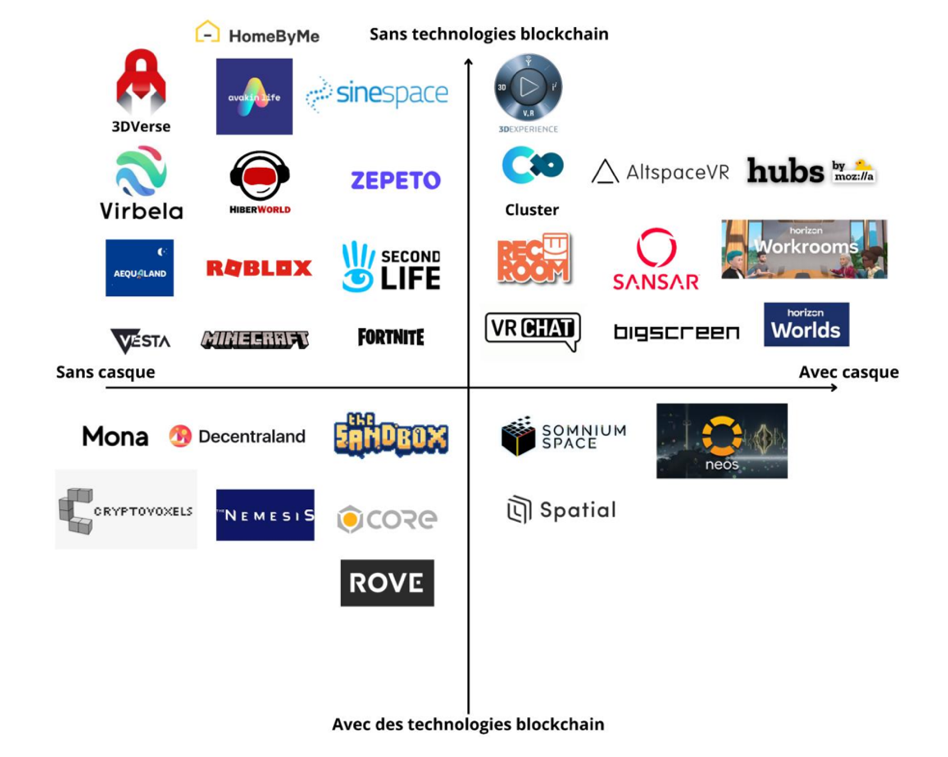 Cependant, cette notion d’immersion induit une confusion entre le métaverse et la réalité virtuelle. Il se trouve que le caractère immersif de certains métaverses nous renvoie à cette technologie, or, la réalité virtuelle est un outil d’accès au métaverse. Pourtant, elle consistait à une certaine date, une technologie permettant à ses utilisateurs une interaction avec un contenu scénarisé au sein d’un environnement immersif contrôlé. Dans leur rapport de mission exploratoire sur le développement des métaverses, présenté auprès des ministères français (MEFR, MC), Camille François, Adrien Basdevant et Rémi Ronfard exposent les typologies de ce dernier. En effet, si les métaverses partagent quelques propriétés communes, ils diffèrent sur tous les autres points (François et al., 2022). Plusieurs typologies de métavers émergent, et à présent, nous pouvons distinguer quatre grandes catégories ; des métaverses sans casques ni chaînes de blocs, des métaverses avec casques mais sans chaînes de blocs, des métaverses sans casques mais avec chaînes de blocs et des métaverses avec casques et chaînes de blocs (François et al., 2022).