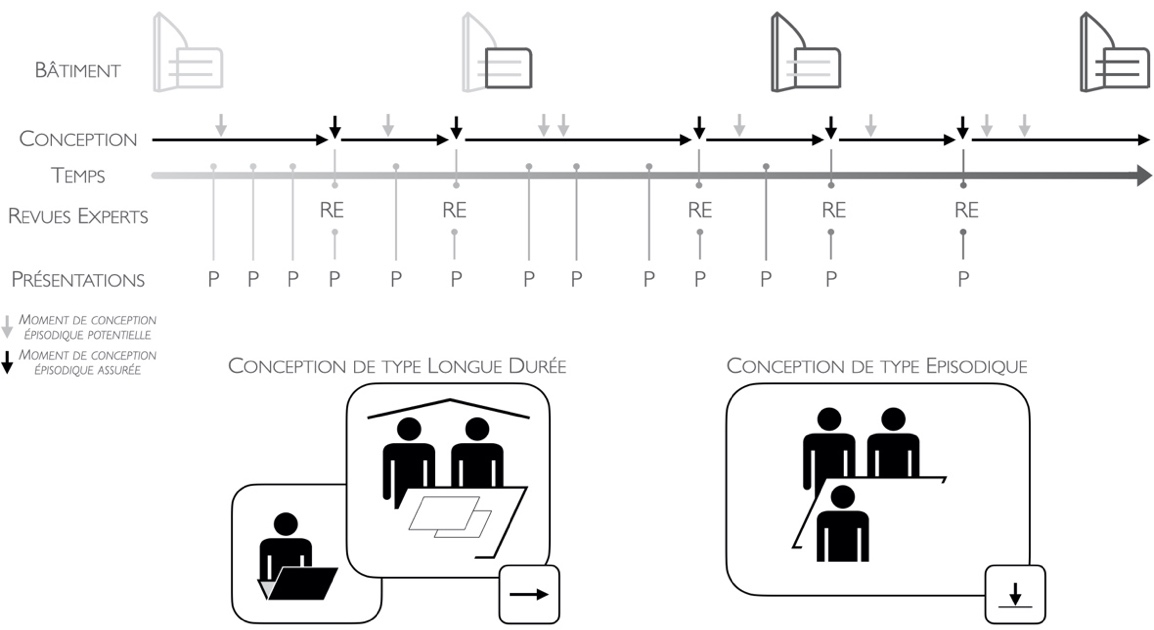 La conception épisodique interrompt ponctuellement, quand les acteurs en ressentent le besoin donc sans que ce soit prévisible, les activités de conception longue (figure 1). Mais les revues avec les experts sont des moments favorisant ces activités de conception épisodique. A l’inverse, la conception longue, activité de fond, est difficilement observable puisqu’elle a parfois lieu en soirée dans les espaces de travail privés. En revanche, les moments de présentations formelles et informelles synthétisent tout le travail de conception effectué au cours de ces intervalles de temps de conception.