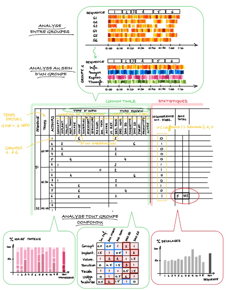 Nous abordons ainsi l’activité cognitive complexe de conception, via ses éléments externalisés, tangibles et précis, en retraçant les informations produites et utilisées par les concepteurs. Pour éviter tout biais de surinterprétation, nous extrayons ces éléments directement depuis le discours des concepteurs et non les documents de représentation du projet.