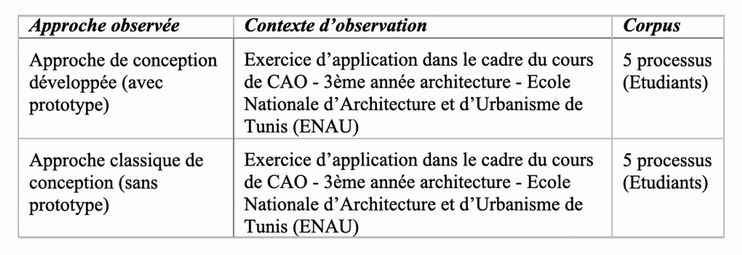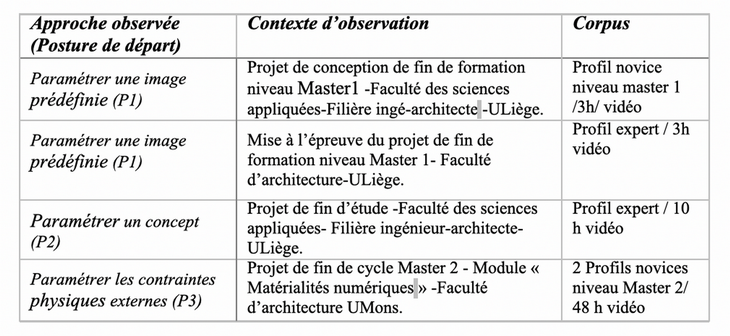 L'observation a été structurée grâce à une enquête préliminaire, celle-ci a permis d’identifier les motivations exploratoires de départ justifiant l’usage d'un modeleur paramétrique dans un processus de conception. Ces motivations ont été catégorisées selon trois postures exploratoires potentielles que le concepteur peut adopter lors de son approche de conception : Paramétrer une image complexe prédéfinie (Posture 1) ; Paramétrer les contraintes physiques (Posture 2) ; Paramétrer un concept (Posture 3). Ces postures paramétriques de départ ont servi de guide pour la sélection des situations à observer. L'objectif de l'observation était de vérifier et de comprendre les différentes postures de départ afin de les caractériser en termes d'activités cognitives. L'observation s'est déroulée dans l'environnement naturel des participants, sans interférer avec leurs méthodes de travail. Le tableau 1 présente le contexte d'observation associé aux trois postures paramétriques possibles.