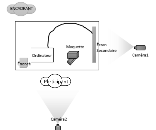 Un dispositif technique capable de capturer tous les facteurs et aspects importants de la situation de conception observée a été conçu et mis à l’essai avant de passer aux contextes d’observation (voir tableau 1). La figure 1 illustre le dispositif d'observation utilisé lors de sa mise à l’essai. Ce dispositif est équipé de deux caméras. La première (cam 1) est positionnée face à un grand écran connecté à l'ordinateur du concepteur et permet de capturer les différentes opérations réalisées par celui-ci. La seconde caméra (cam 2) est orientée vers la scène pour observer les interactions du concepteur avec son environnement. Un logiciel d'enregistrement d'écran est installé sur l'ordinateur de l'acteur avant chaque séance pour éviter tout incident technique. Ainsi équipé, le dispositif permet de saisir simultanément les actions du concepteur sur l'écran de travail et ses interactions avec son environnement, offrant ainsi une vision complète du contexte de l’activité de conception.