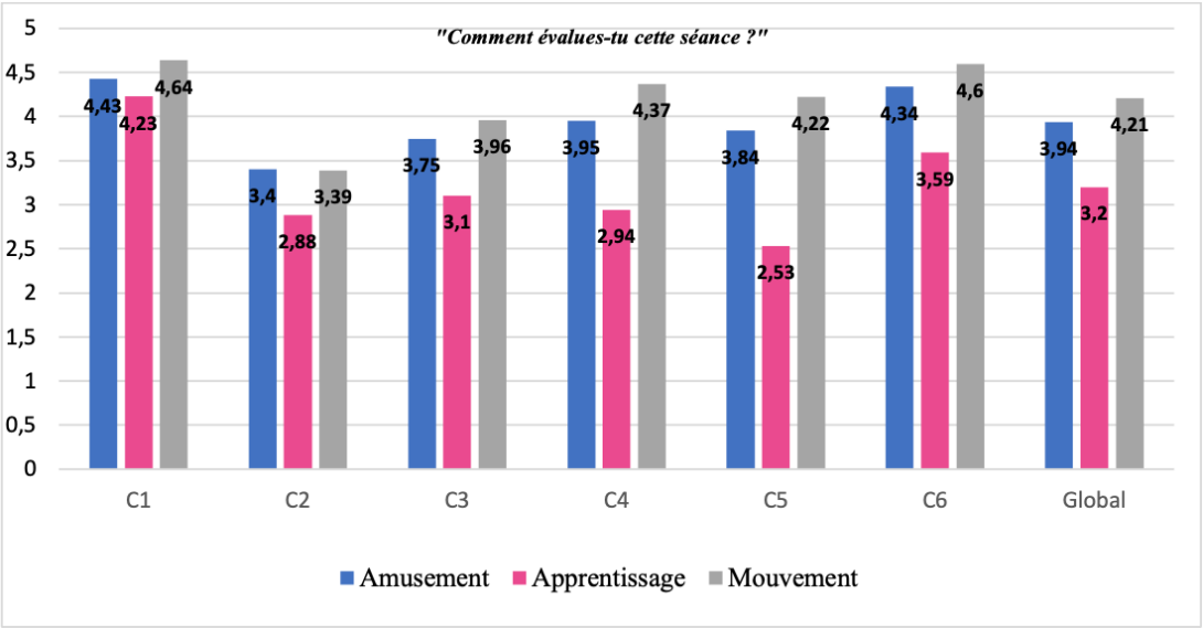 Aussi, à l’issue de chaque séance, les élèves ont rempli un court questionnaire de perception de leçon qui portait sur trois aspects fondamentaux de la qualité d’une leçon d’éducation physique : l’apprentissage, la dépense énergétique et l’amusement des élèves. A partir de la deuxième séance, tout au début de chaque leçon, les élèves ont également décrit les comportements en lien avec les animations santé qui ont été proposées et qu’ils ont eu l’occasion de mettre en œuvre depuis la séance précédente et le début du cycle.