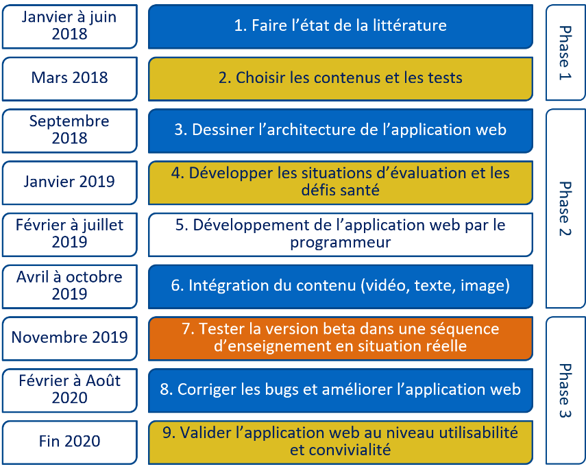Ce projet a été mené grâce à un financement de la Fédération Wallonie-Bruxelles et la Région Wallonne. Le processus de développement comportait trois phases (figure 1). Les étapes 1 et 2 représentent la phase 1, les étapes 3 à 6 représentent la phase 2 et les étapes 7 à 9 représentent la phase 3. Cette méthode est inspirée de celle utilisée par Eklund, Elfström, Eriksson et Söderlund (2018).