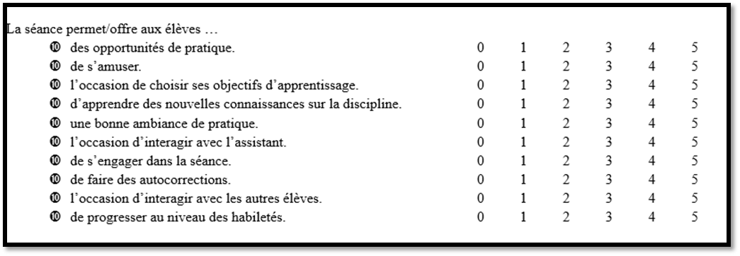 Afin de répondre à nos questions de recherche concernant les principes du PAMIA, le responsable du cours a été invité à compléter, avant chaque séance, un questionnaire visant à déterminer la mesure dans laquelle il estime que les cinq principes seront respectés, sorte de pratique réflexive préséance. Le questionnaire est composé de dix items (deux par principe PAMIA). Au moyen d’échelles de Likert graduées de 0 à 5, il permet de recueillir l’avis de l’intervenant quant à la manière avec laquelle sa leçon devrait respecter chaque principe (figure 2). En fin de séance, l’enseignant complète systématiquement un document semblable afin de fournir son ressenti sur la séance vécue. De leur côté, à l’issue de chaque séance, les étudiants répondent à ce même questionnaire adapté à leur population. Chacun des questionnaires comprend également un espace « Remarques ». Les données récoltées via les questionnaires ont été encodées dans un fichier Excel afin de procéder à une analyse des cinq items pour chacune des leçons.